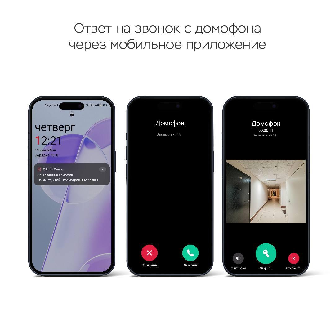 Система предоставляет возможность открыть входную дверь через телефон, используя мобильное приложение «ЛСР» и функцию в «Умном доме». При звонке в квартиру с вызывной панели парадной уведомление приходит также на телефон.