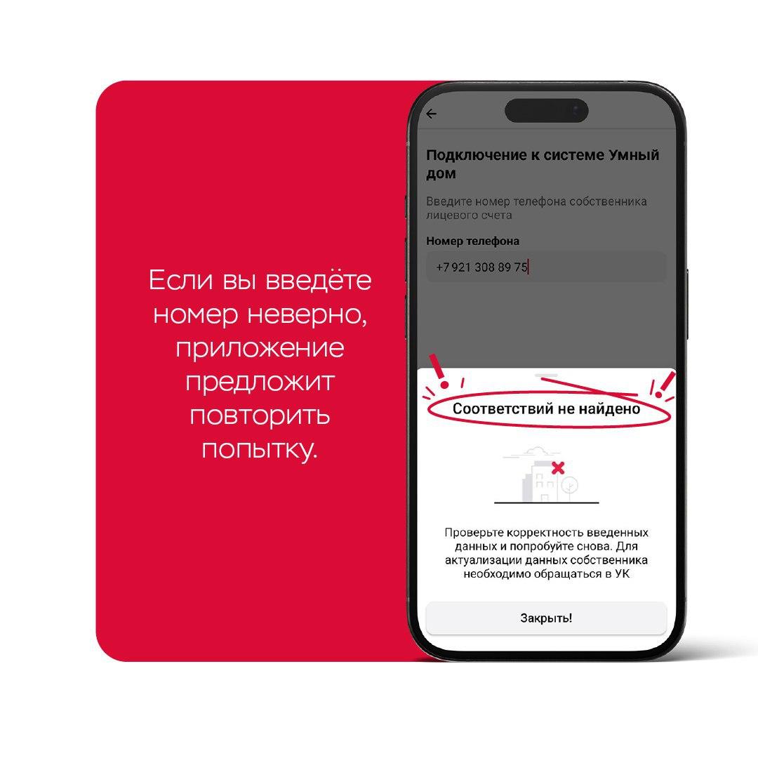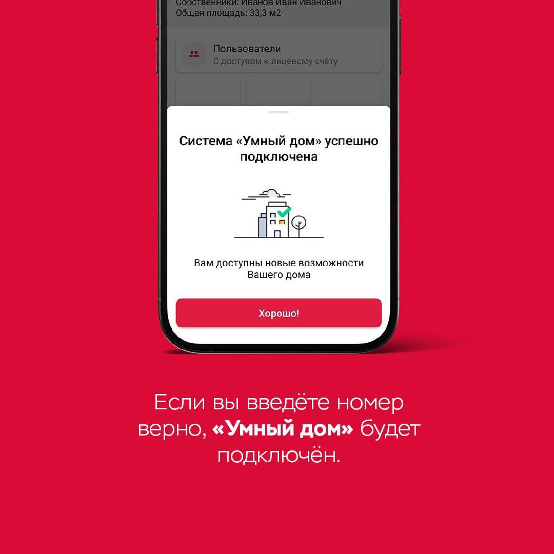 Система проверяет, совпадает ли введённый номер с номером собственника, указанным в базе УК. Если номер совпал, подключение «Умного дома» завершено, можно пользоваться функционалом.