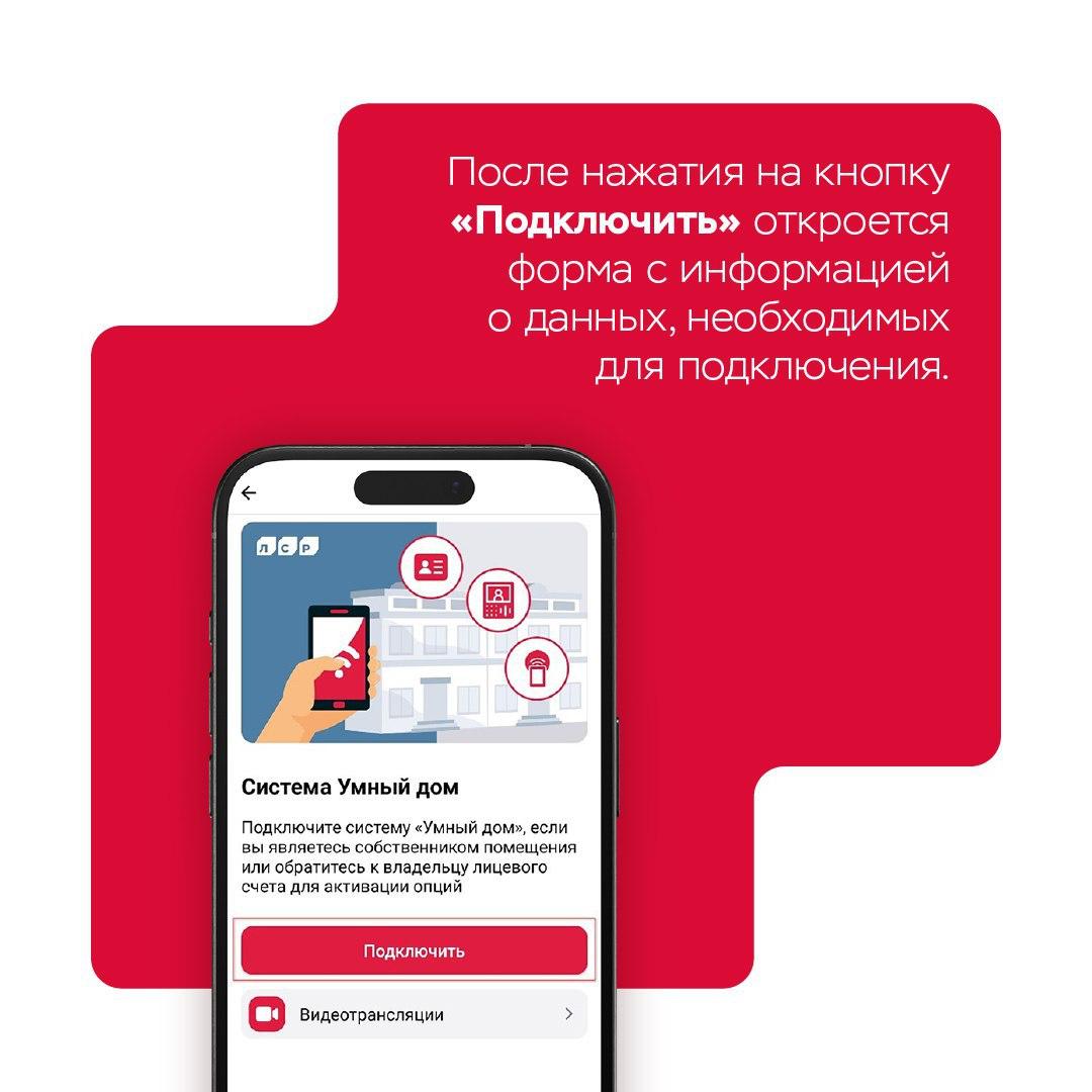 Вход в систему осуществляется в мобильном приложении «ЛСР». Для этого необходимо открыть карточку лицевого счёта собственника в разделе «Проживание» и нажать на баннер «Умный дом».